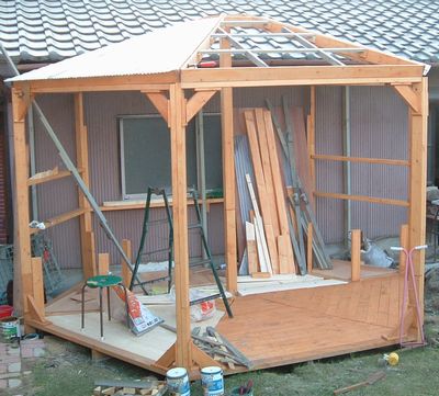 午前中仕事でした。 屋根6枚のうち3枚を乗せ、そのうちの2枚分にアクリル波板を張ったところ