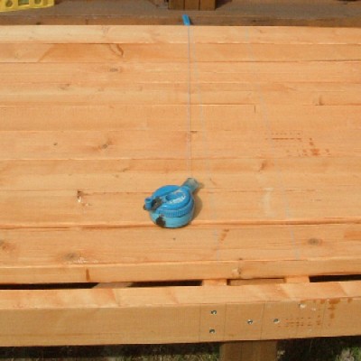 デッキ張りのコーススレッド位置を揃えるのにチョークライン(チョーク式の墨糸?) を使用してみました。なかなか調子がよろしいです。