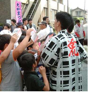 スタンプラリーのスタンプを押してもらおうと、中老さんに迫る子供たち