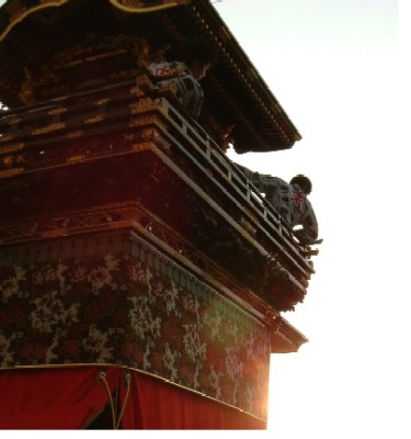 試楽(しんがく)の太田川駅でのどんでん。 山車が夕日に照らされる。