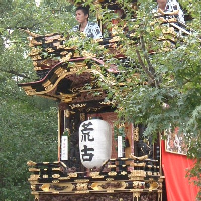 大宮神社の緑に山車の赤幕の赤が一層映える