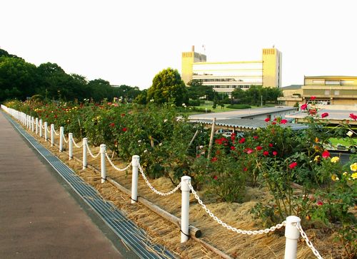 | 右を見ればバラが植えられてる。その向こうに市役所 | 左を見れば大池。手すりにはハト |