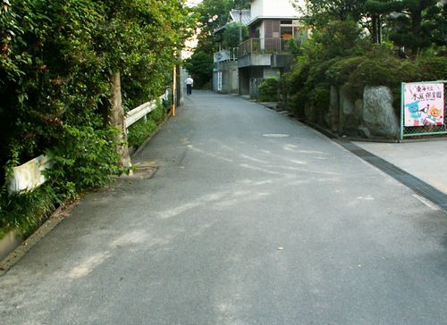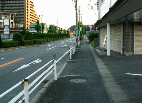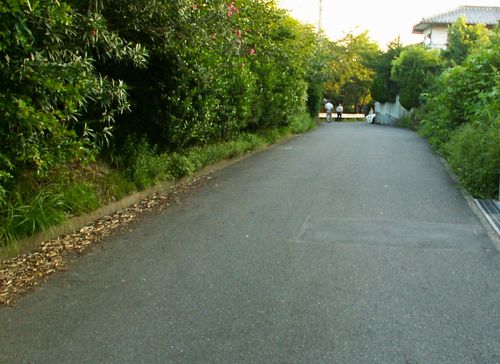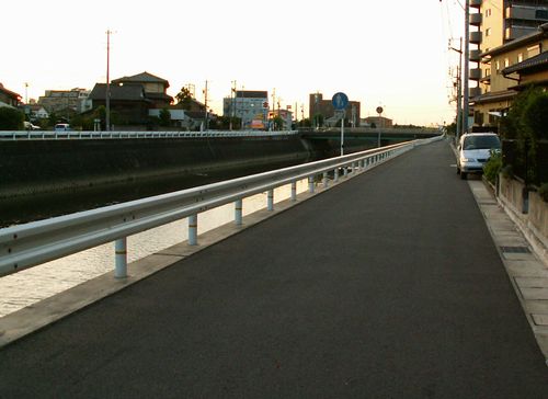 | 自宅を出て、川沿いの道に今まさに歩み出るところ | 川沿いの道を東に向かって進みます |