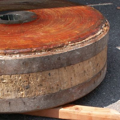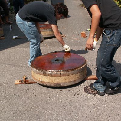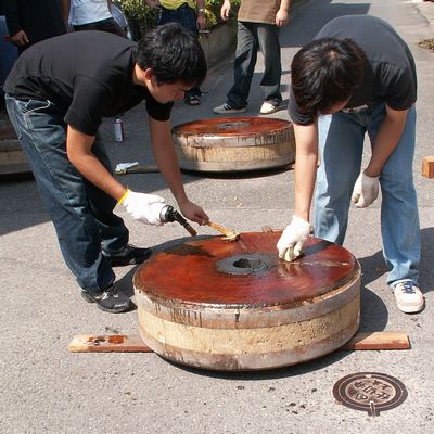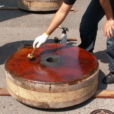 山車の車輪を外し、ロウを溶かして車輪の表面に塗るのです。