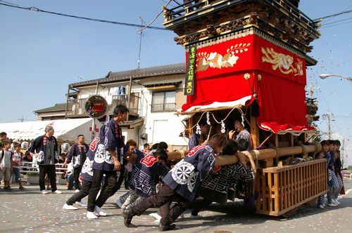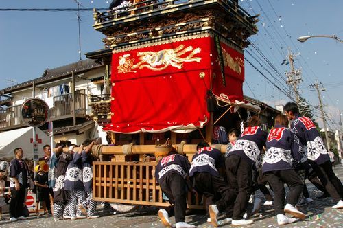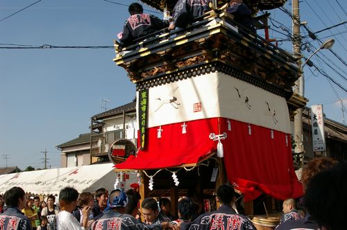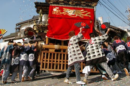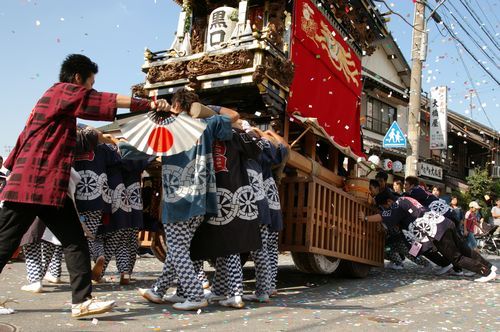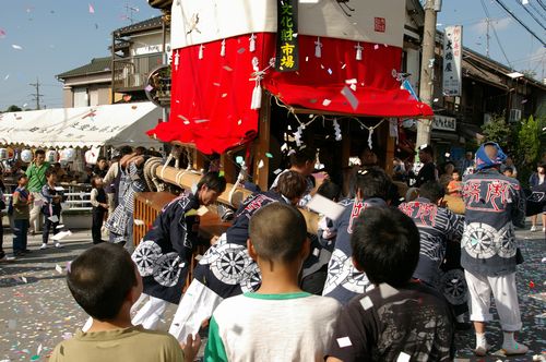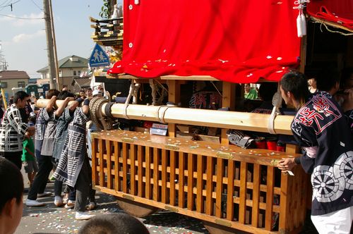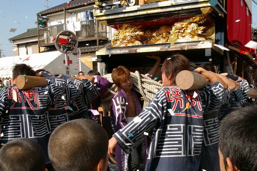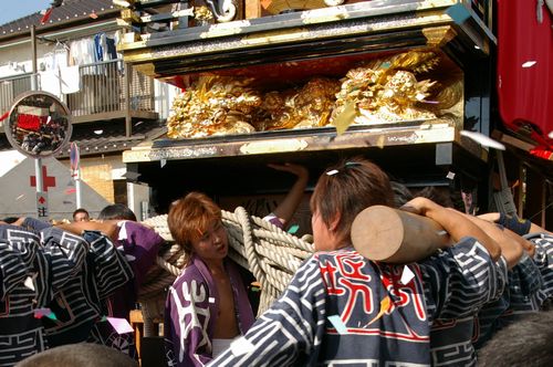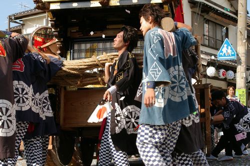 若衆のお兄さんたちが重そうにかついでいるので、心配そうに見つめている3人組