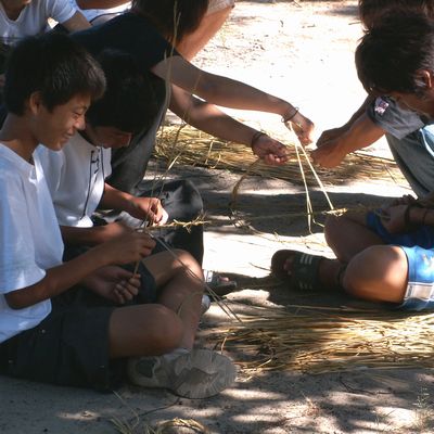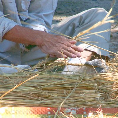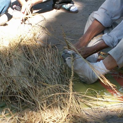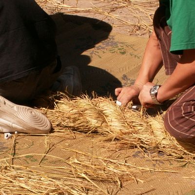 藁は表皮をむいて湿らせて結います。